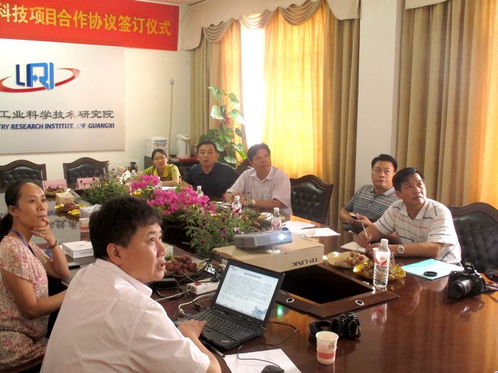 2012年8月7日上午,我院与贵港市科技局在院办公楼三楼会议室签订了“无硫淮山加工新技术”科技合作协议。贵港市科技局局长刘庆强率该局领导班子一行5人前来出席协议签订仪式,受到我院党委书记、院长罗左青、副院长梁智等领导的热情接待。技术中心相关科研人员参加了仪式。