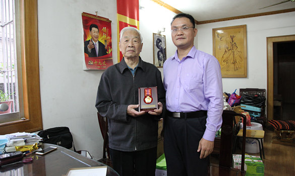 10月23日,轻工院党委委员、董事、副总经理赖开平代表院公司党委将纪念章上门送到夏雨同志手上,当面感谢夏雨同志为保家卫国作出的贡献。