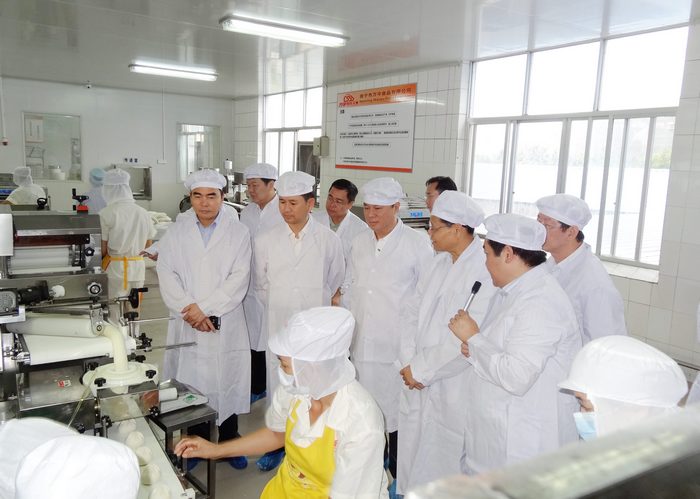 陈武一行先参观了公司中点生产车间,程劲芝总经理详细汇报了阳光早餐的主要生产经营情况,包括早餐生产环节、销售流程、食品安全质量控制管理等;接着参观了食品检验室。