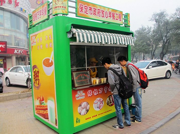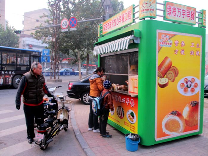 早上7:30时左右,在五四路与永华大街交叉路口处,绿根万宇早餐商亭前站着几位市民。“我要一杯南瓜粥一个鲜肉包”,“我要一个蔬菜包,一杯原味豆浆”……30多岁的网点销售员陆艳灵有点手忙脚乱。今天头一天出摊,不到5点钟她就到商亭接货点货,做好销售前的准备工作。保定市街头突然出现这么多绿根万宇的绿色商亭,引起市民对早餐亭的广泛关注。