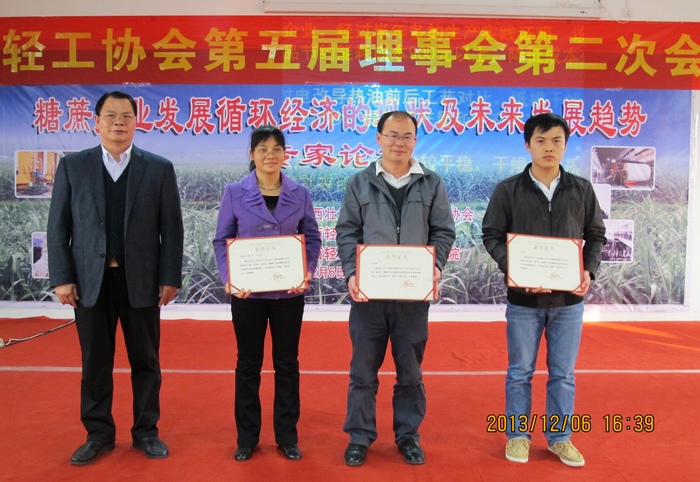 本次专家论坛论文征集工作得到区内外产糖省科技人员的积极响应,共征集到稿件60多篇,涉及制糖的各个领域,水平高内容丰富,经过层层筛选,共有44篇入编论文集,并从入选论文集非广西轻工业科学技术研究院作者的论文中评出一、二、三等奖共12名。会议最后由广西永鑫糖业集团副总裁何华柱、广西轻工协会理事长罗左青分别给获奖作者颁发荣誉证书。
