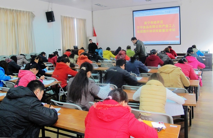 继今年6月和7月广西轻工高级技工学校对南宁市万宇食品有限公司全体员工进行食品生产理论和技术培训后,2013年12月20日下午,万宇食品公司生产员工参加了初级面点师的技能鉴定考试。