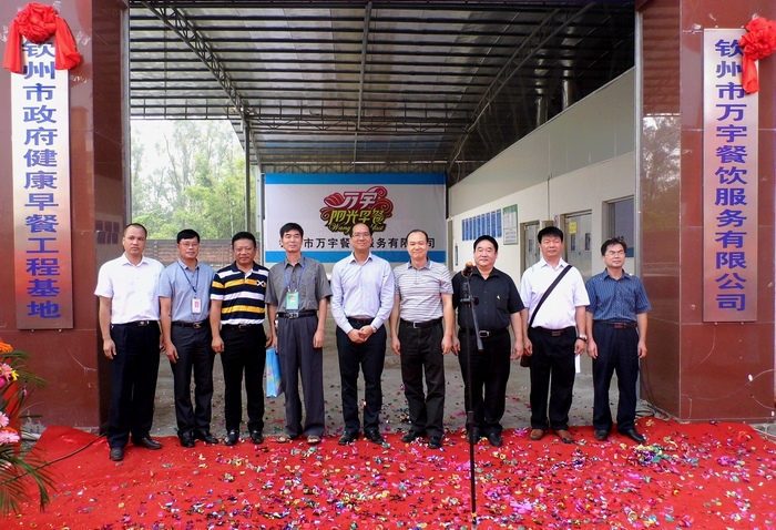 10月16日上午10点,院下属钦州市万宇餐饮服务有限公司(以下简称“钦州公司”)在广西钦州农业学校内的钦州市政府健康早餐生产基地举行了正式投产启动仪式,我院党委书记罗左青、副院长程劲芝、院长助理杨有承、蒋敬全以及院下属广西南宁万宇科技公司、南宁万宇食品公司和柳州万宇餐饮公司代表参加了本次庆典。参加启动仪式的还有:钦州市食品安全监督管理委员会办公室主任、食药局局长申荣洲、副局长冯晓斌、广西钦州农校副校长覃效敏、食安办副主任陈建统等有关方面的领导及老年大学的20多位老同志。