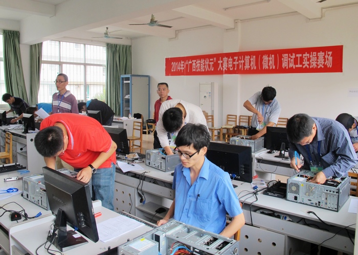 本次大赛共设10个工种,分别为:焊工、制冷设备维修工、汽车维修工、电子计算机(微机)调试工、起重机驾驶员、叉车司机、银行柜面业务、花卉园艺师、保洁员(女农民工)、电信10000话务服务员。共有来自广西十四个地级市和自治区直属企事业工会的240多名选手参加比赛,他们都是各地市经过预赛决出的前3名选手,可谓高手如林。我院工会选送的5名选手有2名进入决赛,分别是南宁万宇食品公司的卢汉能(焊工)和广西南宁万宇科技公司的张家伟(电子计算机)。经过2天1夜的理论考试和实际技能操作比赛,我院张家伟夺得电子计算机比赛的第6名(比赛奖励前十名)。