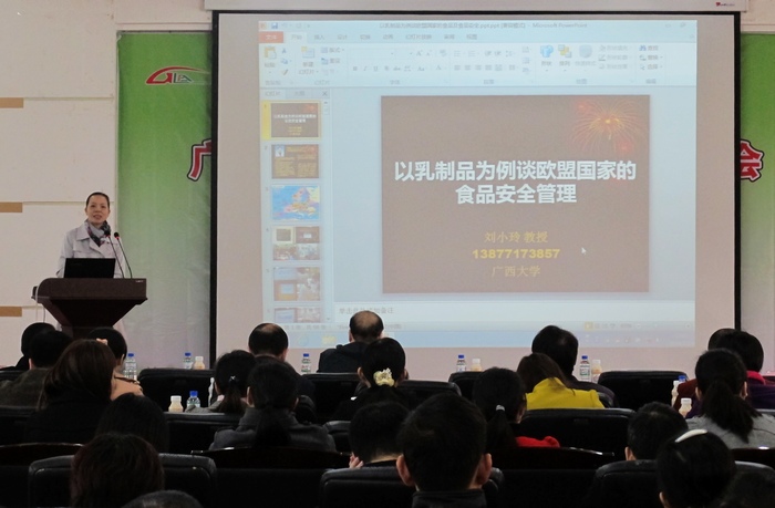 广西大学轻工与食品工程学院副院长、教授、博士生导师,广西大学食品安全研究中心主任刘小玲向本次报告会做了“以乳制品为例谈欧盟国家的食品安全管理”的主题发言。她结合自身在欧盟多国工作、学习的经历,讲述欧盟发达国家对食品安全的政策、监管的成功经验,探讨广西食品安全的办法;广西皇氏甲天下乳业股份有限公司生产总监、高级工程师孙宁以该企业为例,从广西乳业的实际出发,给与会代表分享了“广西乳业的发展与安全”专题报告;支持单位江苏久吾高科技股份有限公司项目经理凌国庆结合该企业的具体案例,讲述膜分离等新设备、新技术在食品加工,尤其是乳制品加工安全中发挥的巨大作用;广西产品质量监督检验研究院工程师段玉林从自身食品安全监管的角度,做了“食品风险预警与处置”的专题发言;广西食品安全协会副秘书长、食品安全管理体系国家注册审核员、国家高级营养师王天影以生动的案例,通俗易懂的语言讲解“食品安全的概念与食品链及其安全危害”,使与会代表深刻理解食品安全的含义;南宁市万宇食品有限公司综合管理部经理、国家高级营养师张蓥以“食品加工安全控制”为主题,详细阐述了该企业如何从原辅材料、生产过程、产成品等多个环节,全程监控食品的生产,确保每份早餐食品安全、营养、健康、便捷。作为支持单位,该企业还为大会提供了安全、营养、美味可口的方便快餐供大家品尝。