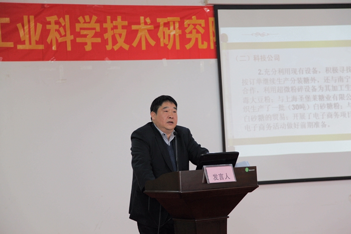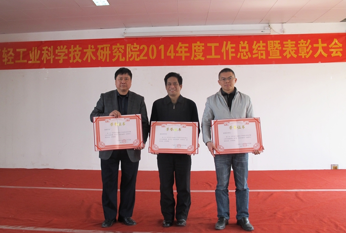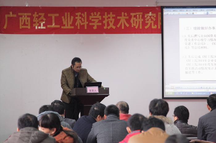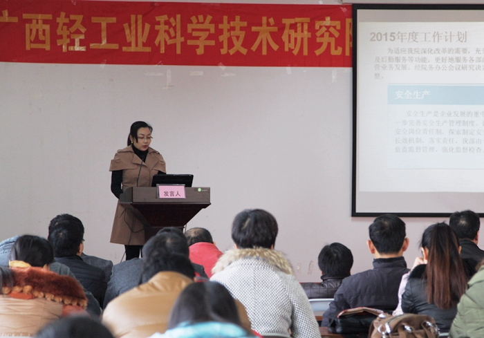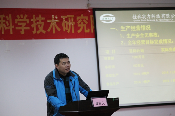 程劲芝作了总结性发言,他指出:2014年我院克服重重困难,全面完成自治区国资委下达的任务和指标,成绩来之不易!万宇食品公司和万宇科技公司超额完成任务,值得肯定和表扬,但大家一定要保持清醒的头脑。2015年,早餐销售还将面临经济总体下滑、南宁地铁和立体交通建设、柳州网点数下降等不利因素的影响,需要大家继续努力;科研上一定要努力开发出能快速产业化的高附加值产品,为我院培育新的增长点。