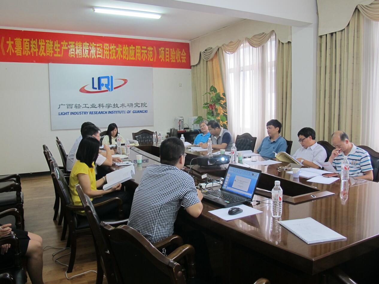 2016年9月14日下午,南宁市科学技术局组织专家在我院三楼会议室对我院与广西农垦明阳生化集团股份有限公司共同承担的南宁市科学研究与技术开发计划项目“木薯原料发酵生产酒精废液回用技术的应用示范”(合同编号:20121230)进行会议验收。专家组听取了项目完成情况汇报,查阅了相关材料,经质询和讨论,专家组认为该课题完成了任务书规定的各项考核指标,一致同意通过验收。
