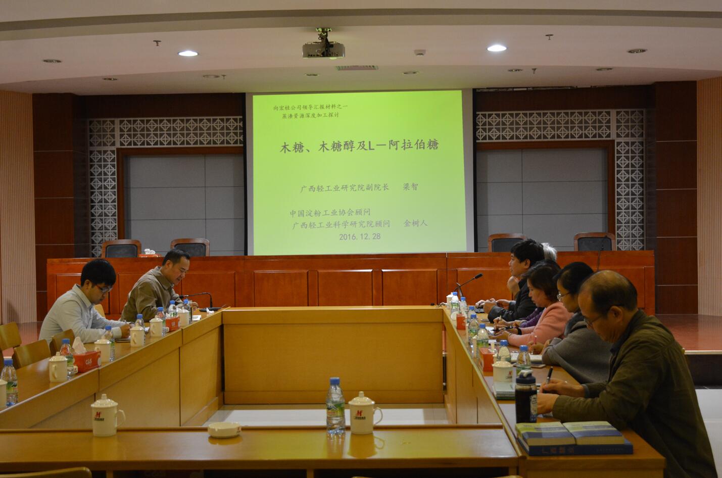 本次汇报的主题是《木糖、木糖醇和L-阿拉伯糖》,首先由院技术顾问金树人介绍国内外木糖、木糖醇和L-阿拉伯糖的研究历史、产业现状及未来的发展趋势。副院长梁智对我国北方以玉米芯为原料生产木糖、木糖醇和L-阿拉伯糖的产业形势及遇到的环保压力、原料供应不足等瓶颈问题进行剖析,指出广西以蔗渣为原料的生产优势。党委书记罗左青结合广西糖业几十年的发展历程及现今遇到的困境做了补充,对广西糖业的“双高基地建设”和“二次创业”进行分析,指出广西以蔗渣为原料生产木糖、木糖醇和L-阿拉伯糖既符合国家产业转移政策,又符合广西糖业深加工发展的需求,前景广阔。