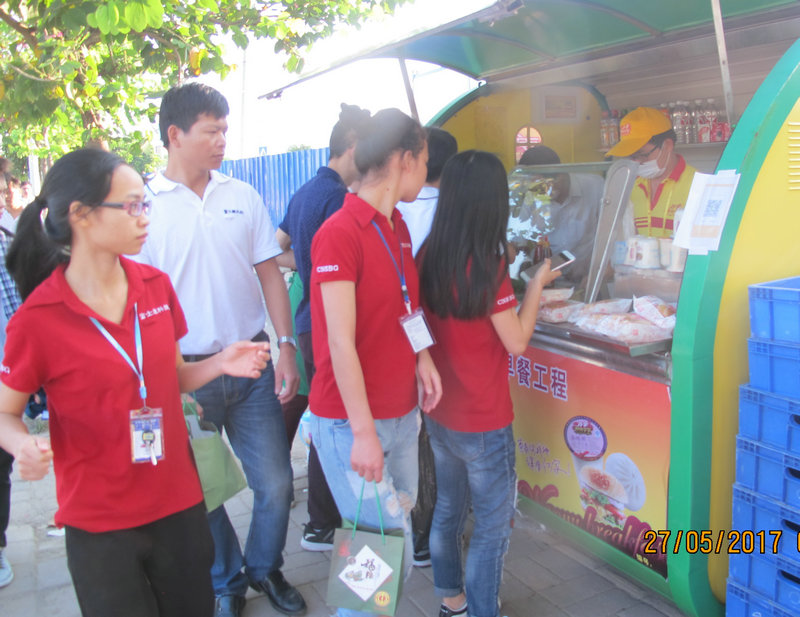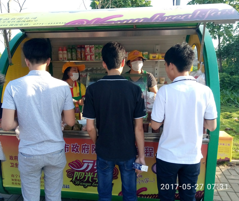 从2017年5月27日起,在南宁市政府的大力支持下,宏桂集团下属广西轻工业科学技术研究院下属公司--南宁市万宇食品有限公司政府“阳光早餐”工程正式入驻企业,八辆标有“南宁市政府阳光早餐工程”标识的早餐商亭在南宁江南富士康科技园正式亮相了,橘黄色的餐车车体、中西餐皆有的早餐品种以及销售人员整洁统一的着装,让富士康公司职工眼前一亮,购买早餐者络绎不绝。