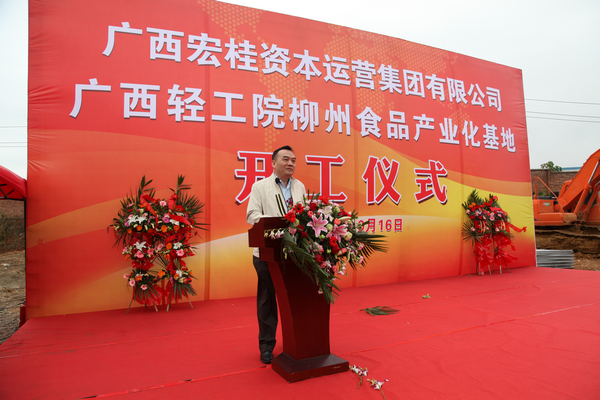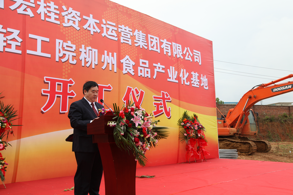 接着宏桂集团党委书记、董事长何有成发表了重要讲话。他强调,轻工院在食品研发等领域积累了相当丰富的经验,具有较雄厚的研发实力。今天开工的柳州食品产业化基地项目是轻工院落实“十三五”规划之举。集团对此十分重视,并给予大力支持。该项目对于宏桂集团扩大科技产业版图,拉长产业链条,增强科技实力,推动产业化进程具有战略性的意义。何董事长还对轻工院和承建单位对该项目建设提出了意见和要求。