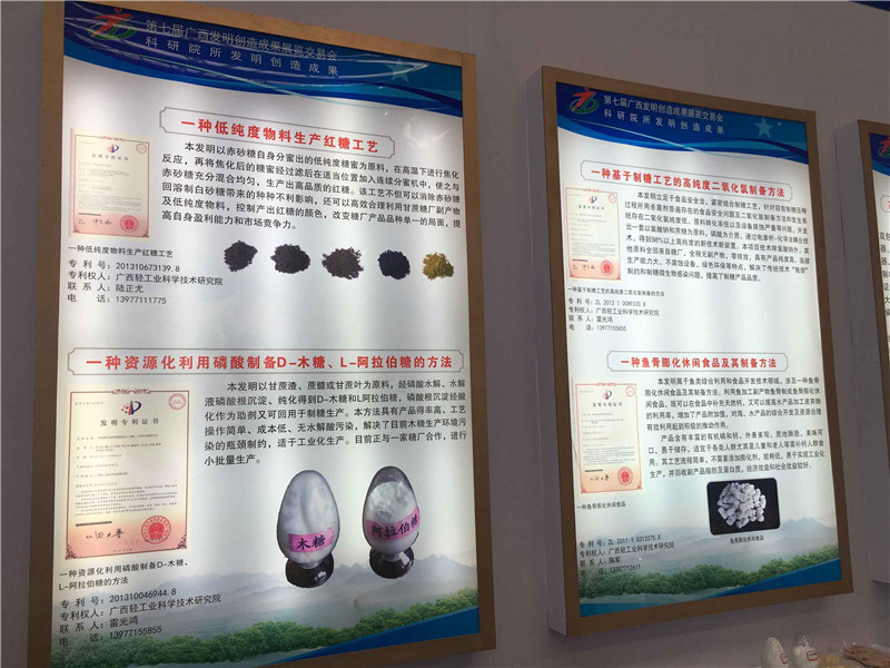 此次展会紧扣“推动广西创新驱动发展”主题,对全区400多家企业、高等学校、科研院所、社会发明人和中小学生的最新发明创造成果进行展览。轻工院在展会上展示了自主研发的一种低纯度物料生产红糖工艺、一种鱼骨膨化休闲食品及其制备方法、一种基于制糖工艺的高纯度二氧化氯制备方法及一种资源化利用磷酸制备D-木糖、L-阿拉伯糖的方法等四项专利及专利产品,并发放有关轻工院自主研发技术的宣传资料。产品以及展示的技术受到现场观众的热情咨询。