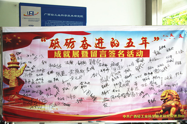 10月30日至10月31日,轻工院领导班子、院本部各部门、广西万宇科技公司、南宁万宇餐饮连锁公司、南宁万宇食品有限公司等200多名党员干部职工按照活动安排,分批次准时有序来到院办公楼一楼大厅观看“砥砺奋进的五年”成就展。大家一起参观学习党的十八大以来在以习近平同志为核心的党中央在治国理政伟大实践中,我国社会主义经济建设、政治建设、文化建设、社会建设、生态文明建设以及国防和军队现代化等建设取得的历史性成就。参观完毕后各党员干部职工在“砥砺奋进的五年”成就展留言墙上留言签名。另外,院党群部于11月1日将成就展挂图先后送往柳州、钦州,组织柳州万宇餐饮公司、柳州艾特吉公司、钦州万宇餐饮服务公司的党员干部职工进行观看学习。
