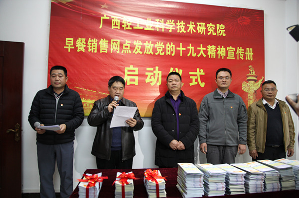 仪式首先由院党委副书记、工会主席文天国致开场词。他表示,轻工院党委举办早餐销售网点发放党的十九大精神宣传册的启动仪式,不仅是院党委高度重视党的十九大精神学习宣传的一个生动体现和具体实践,更是轻工院作为国有企业引导正确舆论、弘扬正能量的责任和义务。随继,院下属南宁、柳州、钦州各早餐公司主要负责人依次承诺表态,纷纷表示坚决服从院党委的部署安排,全力配合院党委将党的十九大精神在广大消费者中宣传好、贯彻好、落实好,一起致力于把轻工院推上发展新征程。