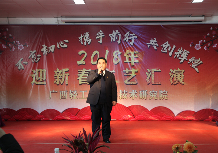 广西轻工院2018年迎新春文艺汇演于2月8日下午在院四楼多功能厅举行。院党委书记、院长程劲芝,党委副书记、工会主席文天国,党委委员、副院长杨有承,党委委员、副院长赖开平,党委委员、纪委书记肖凯以及来自院本部、下属各公司的200多名员工欢聚一堂,辞旧迎新,欢度美好时光。院党委书记、院长程劲芝代表轻工院送上新春致辞。