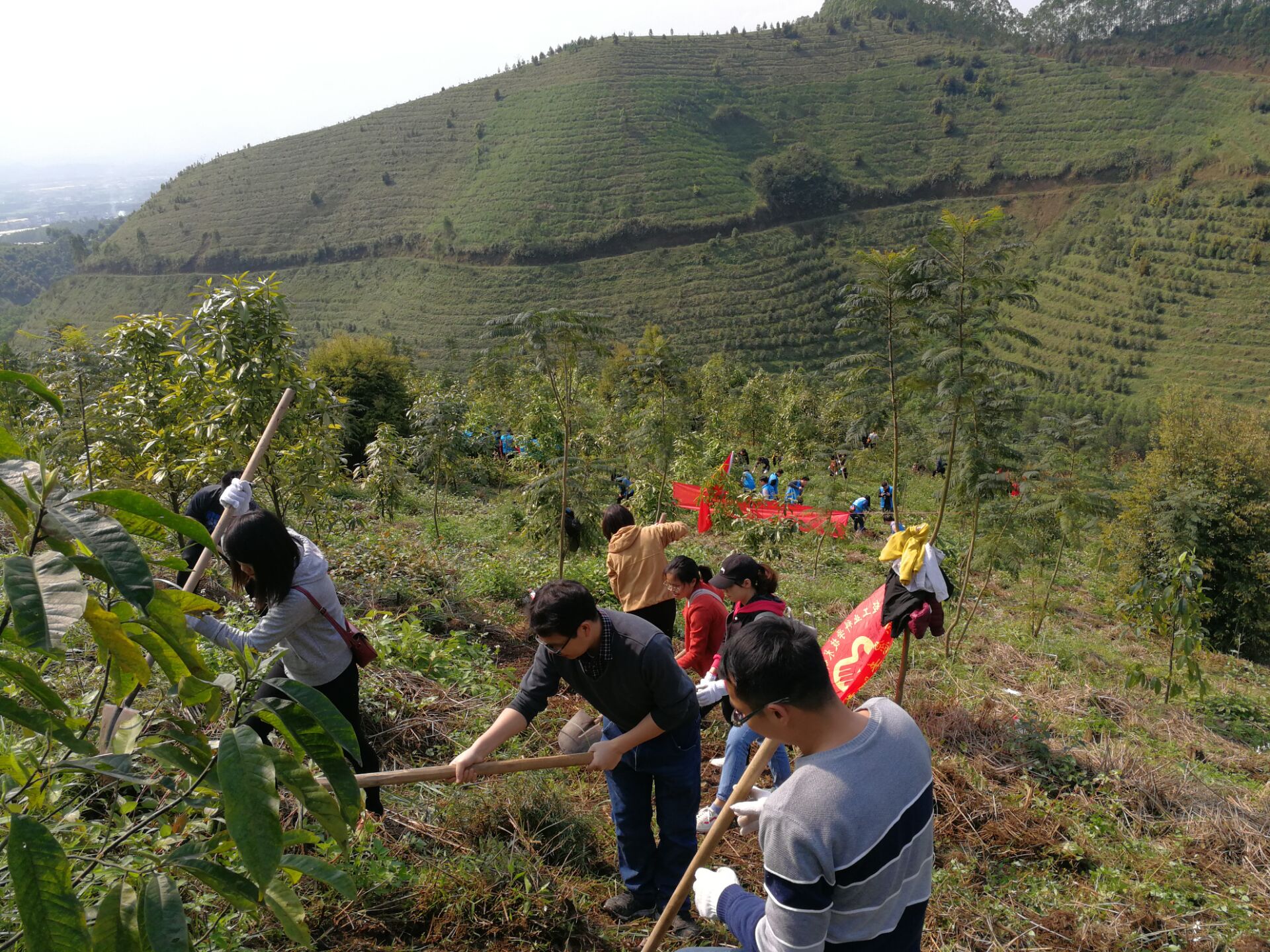 趁着明媚的阳光,青年同志们扛起锄头和铲子爬上了杂草丛生的山坡,来到各自负责的区域。青年同志们斗志昂扬,充分发扬了不怕脏、不怕苦、不怕累的精神,撸起袖子,挥起锄头将周边的杂草一一铲除。经过1个小时的辛勤劳作,一大片杂草被清除,一棵棵先前种下的小树木傲然挺立。