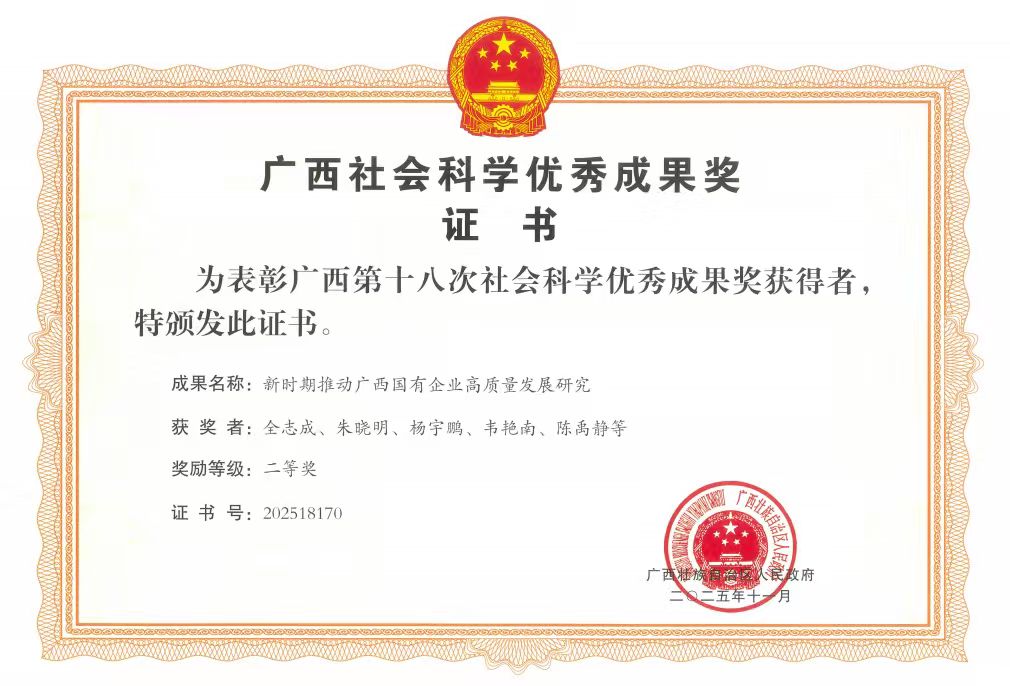 近日,自治区人民政府正式公布广西第十八次社会科学优秀成果奖获奖名单。广西轻工业科学技术研究院有限公司副总经理全志成以第一作者身份完成的研究报告《新时期推动广西国有企业高质量发展研究》,成功斩获研究报告类二等奖。