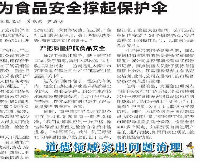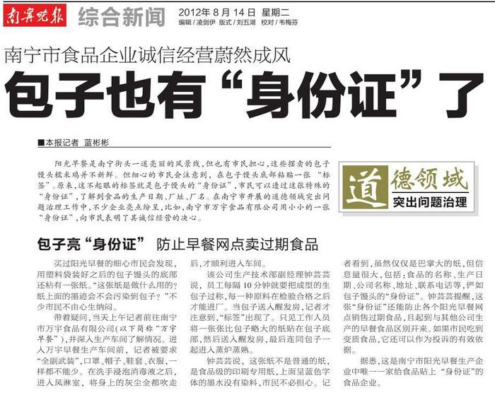 “包子也有‘身份证’了”——南宁晚报和南宁日报报道南宁市万宇食品有限公司诚信经营