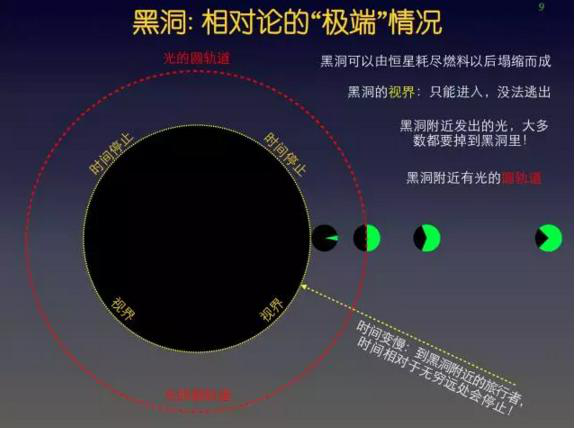 在数学上,黑洞的时空有很多奇妙的结构。比如,黑洞有一个叫做“视界”的结构。在“时空图”上,视界把时空分成两部分,一部分是可以和远处联系的,而另一部分,是无法和远处联系的。当星体塌缩成黑洞时,坐在星体表面的观测者会穿过黑洞的视界,而站在外面的观测者,则不会看到星体表面的观测者穿过视界,只是看到他的运动越来越慢,像是被“冻结”在视界表面。