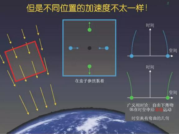 如果我们进入自由下落的参照系,引力好像没有了,是不是意味着引力只是参照系变换的产物,而不是真实的物理存在呢?不是的,因为宏观上不同位置上自由下落的参照系是不同的!如果我们考虑一个足够大的空间站,就会发现空间站不同位置上的物体会有相对加速的现象,这就是所谓的潮汐加速度。而这个加速度,是对所有物体都适用的。爱因斯坦把这个归结于时空几何的弯曲。