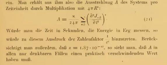 爱因斯坦在1916年就预言了引力波的存在:他发现自己的方程有一组解,和电磁波的性质类似,以光速传播。但是他在文章里又说(下图中最后一句),因为这个引力波辐射的能量很少,在所有能想得到的情况下,引力波的辐射都可以被忽略。