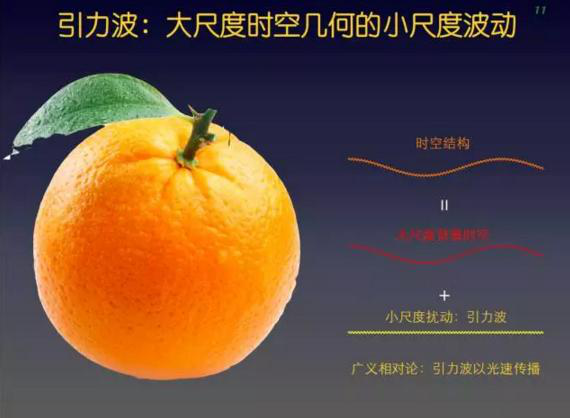 想了解引力波所对应的时空几何,需要把刚才光滑的苹果变成粗糙的橘子:橘子表面有两种弯曲的几何结构。大尺度的时空几何(橘子的半径)代表了宇宙空间中的引力,而小尺度的几何(粗糙的点点)代表了引力波。