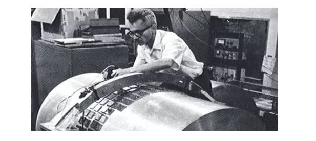 韦伯和他设计的共振棒探测器。引力波驱动铝棒两端振动,从而挤压表面的晶片,产生可测的电压。图片来自:马里兰大学。