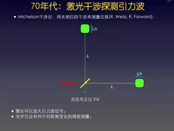 MIT的实验物理学家Weiss注意到,引力波对物体之间距离的变化,和物体之间本来的距离成正比。这样的话,如果把物体之间的距离拉的很远,并且把它们做成镜子,然后用激光测距的方法测量镜子之间的距离,就可以成倍的提高对引力波测量的精度。