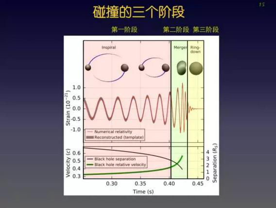 第二阶段。到两个黑洞快并合的时候,引力波频率达到100Hz,轨道频率50Hz,就是每秒钟转50圈。这个时候两个黑洞已经快形成一体了,它们每个人“中心”之间的距离大概是两百公里左右。